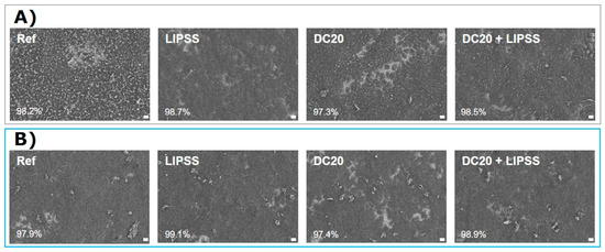 Growth of human keratinocytes (HaCaT) after 7 days on different specimens: (A) on steel and (B) on Ti6Al4V. Note that the cell density is nearly confluent. Only the cluster microstructure without LIPSS (DC20) indicated some free spaces with a confluence < 97.4%. HaCaTs could spread into and over the dimple structure and were not inhibited in extension. (FE-SEM Merlin VP compact, 1000× magnification, 5 kV, HE-SE detector scale bars = 20 µm; quantification of confluence by ImageJ).