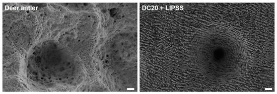 Natural versus artificial structures. Comparison of nano- and microstructures of a deer antler surface (left) and a steel surface with laser-induced micro-dimple clusters combined with nanostructures from periodic surface structuring (DC20 + LIPSS) (right). This laser structure is similar to nature’s model and facilitates the best effects on initial human keratinocyte adhesion. (FE-SEM Merlin VP compact, 5 kV, HE-SE detector; 3000× magnification, scale bars = 2 µm).