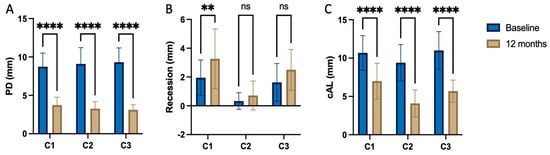 Intragroup comparisons between preoperative and post-operative clinical parameters (A) probing depth, (B) Recession and (C) clinical attachment loss. ** p < 0.01; **** p < 0.0001; ns—non-significant.