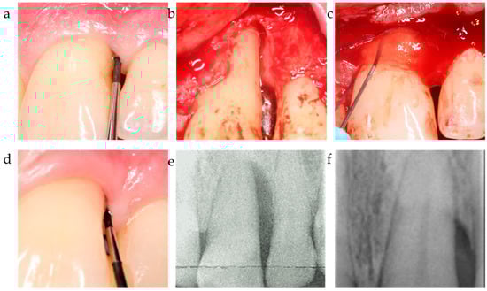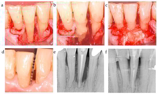 Center 1 showcase: (a,b) radiographically observed change in bone level around tooth 31 before surgery and 12 months post-op; (c,d) defect extension and defect grafting at surgery; (e,f) the result of grafting.