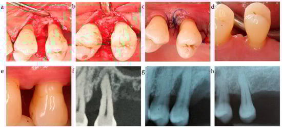Center 2 showcase: (a–c) defect extension, defect grafting at surgery, and suture; (d,e) clinical outcome at 12-month exam. (f–h) radiographically observed change in bone level around tooth 25 before surgery and 12 months post-op.