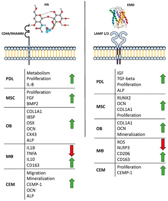 Schematic illustration of the mechanism of action reported for xHya (left) and EMD (right). PDL = periodontal ligament fibroblast; MSC = mesenchymal stromal cell; OB = osteoblast; MO = macrophage; CEM = cementoblast. Red arrows indicate downregulation, green arrows indicate upregulation.