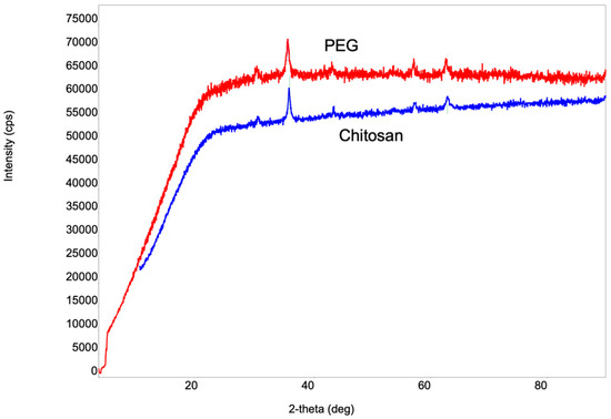 X-ray diffractogram of Fe3O4 NPs coated with PEG and chitosan. The crystal structure of the magnetite (Fe3O4) NPs synthesized via chemical co-precipitation and coated with PEG and chitosan was analyzed. Characteristic X-ray lines of magnetite NPs were observed in both samples. Therefore, the d-spacing values of the significant peaks match well (ICDD DB card number 01-073-9877).