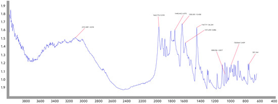 In the FTIR spectrum of the chrysin-loaded Fe3O4@Chitosan system (Figure 3D–F), all absorption bands belonging to chrysin were observed. In the spectrum, the bands corresponding to 2921 cm−1 and 2877 cm−1 correspond to chitosan, and the peaks in the range of 400–600 cm−1 coincide with the absorption bands of Fe3O4. The intensity of the chitosan absorption bands, which is clearly visible in the spectrum at a 1:0.5 concentration of Fe3O4 and the drug substance, is weakened at the 1:1 and 1:2 concentrations. This shows that the amount of chrysin in the system increased (Table 3).