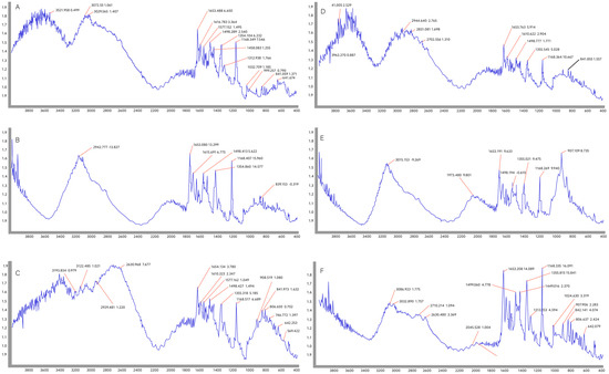 FTIR spectra of the samples obtained after attaching chrysin on Fe3O4@PEG and Fe3O4@chitosan in different ratios: (A) Fe3O4@PEG250 with a 1:0.5 PEG-chrysin ratio; (B) Fe3O4@PEG500 with a 1:1 PEG-chrysin ratio; (C) Fe3O4@PEG1000 with a 1:2 PEG-chrysin ratio; (D) Fe3O4@Chitosan250 with a 1:0.5 chitosan-chrysin ratio; (E) Fe3O4@Chitosan500 with a 1:1 chitosan-chrysin ratio; (F) Fe3O4@Chitosan1000 with a 1:2 chitosan-chrysin ratio. The characteristic peaks in the spectra indicate that PEG and chitosan-coated magnetite NPs were successfully synthesized, and the chrysin drug was loaded into them.