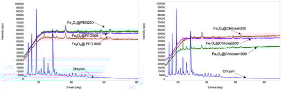 The comparative studies of the X-ray diffractograms were conducted on the samples obtained from magnetite NPs with different coating agents and loaded with various amounts of chrysin (Figure 4).