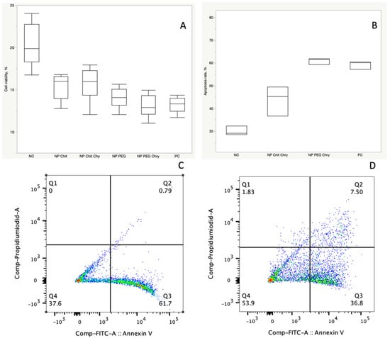 Cell viability and apoptosis rate under treatment with Fe3O4 NPs coated with PEG and chitosan. (A) Cell viability assessment using the MTT test with a 5 µg/mL treatment of Fe3O4@PEG500 with a 1:1 PEG-chrysin ratio and with 5µg/mL of Fe3O4@Chitosan500 with a 1:1 chitosan-chrysin ratio (PNP_PEG_Chry vs. NP_Chit_Chry = 0.0033). NC = negative control, where no treatment was administered. PC = positive control, where a treatment with 5 μg/mL of pure chrysin was applied. (B) Apoptosis rates following 48 h of treatment with Fe3O4@PEG500 and Fe3O4@Chitosan500 NPs, comparing the effects of coating with PEG versus chitosan. NC = negative control, representing the condition where no treatment was administered, serving as a control group. PC = positive control, representing the positive control group where a treatment of 5 μg/mL of chrysin was applied, serving as a reference for assessing the impact of the treatment with pure chrysin. (C) Representative images from the FACS experiments conducted after 48 h of treatment with Fe3O4@PEG500, inducing apoptosis in 61.7% of cells. (D) Representative images from the FACS experiments conducted after 48 h of treatment with Fe3O4@Chitosan500, inducing apoptosis in 36.8% of cells. Viable cells stain negative for both PI and Annexin V (Q4); early apoptotic cells stain positive for Annexin V and negative for PI (Q3); necrotic cells stain positive for PI only (Q1); and late apoptotic cells stain positive for both Annexin-V and PI (Q2). In order to make the text shorter we decided not include, because the image is self-descriptive.
