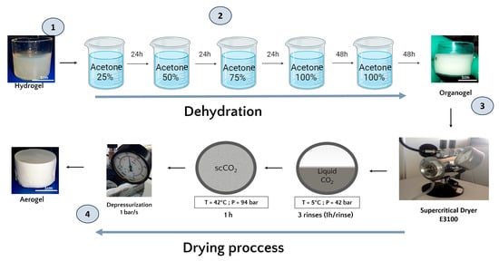 Once formed, and prior to the drying process, the hydrogels were dehydrated in successive baths of 24 h in increasing concentrations of acetone (25%, 50%, 75%, and 100%). The volume (500 mL) of acetone used was largely sufficient in volume to ensure that the water released by the hydrogel did not significantly modify the acetone concentration of the exchange solution. A total of 48 h was added to the 100% acetone baths to guarantee that the acetone water exchange was complete along with the obtention of an organogel (Figure 1) [27].