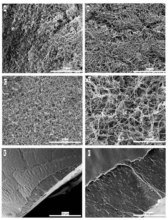 Scanning electron microscopy (SEM) images were utilized to compare the three-dimensional network structure between the hydrogel and aerogel obtained after scCO2 drying. The results of this analysis, presented in Figure 2B,D, demonstrate the preservation of the three-dimensional fibrin network. The network fibres exhibited a rough, non-smooth appearance compared to purified fibrin fibres [33]. This roughness is potentially attributed to other HPL components, especially proteins that attach to the network. Previous studies have shown that certain growth factors such as β-FGF and VEGF have an affinity for fibrin network [34].