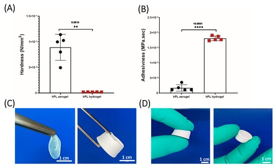 The texture profile analysis (TPA) applied to HPL hydrogels and aerogels enabled a precise evaluation of their mechanical properties and a detailed comparison of their robustness. Measurements of parameters such as hardness and adhesiveness, as presented in Figure 3, highlighted significant disparities. Hardness, defined as the maximum force required for sample compression, is derived from the peak force observed during the first compression cycle. Adhesiveness, on the other hand, assesses the material’s tendency to adhere to the contact surface with the piston and is evaluated by calculating the area under the negative curve between the two compression cycles [40]. The results clearly demonstrate that the aerogels exhibit greater hardness compared to the hydrogels, while being less adhesive, thereby significantly enhancing their manipulability, as illustrated in Figure 3C,D.