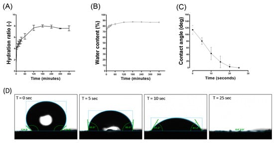 The water content was investigated as the amount of liquid absorbed by the hydration, as expressed in Equation (3), where () is the wet sample weight and () is the dry sample weight: