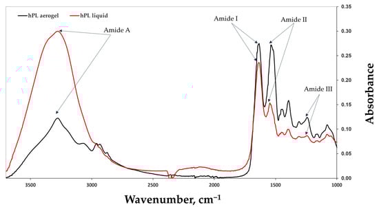 The FTIR spectra of liquid HPL (in red) and HPL aerogels (in black), highlighting the characteristic peaks of amides I, II, III, and A. The comparison between the FTIR spectra of liquid HPL and HPL aerogels allows for the assessment of any structural changes or preservation of molecular characteristics induced by the aerogel formation process. The results provide valuable insights into the chemical composition and structural integrity of HPL aerogels.