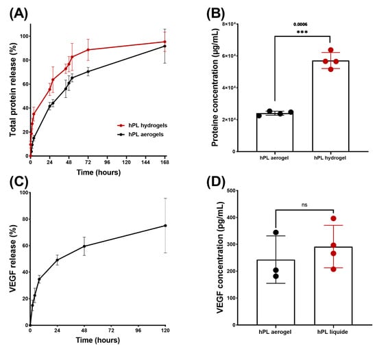 Results of release studies, quantifying total protein release and VEGF release. (A) Comparison of release kinetics, presented as percentages, between HPL aerogels (in black) and HPL hydrogels (in red). (B) Comparison of released protein concentrations between HPL aerogels and HPL hydrogels at 168 h. (C) Release kinetics of VEGF from HPL aerogels and HPL liquid. (D) Comparison of VEGF concentrations in HPL aerogels at 120 h and liquid HPL. Statistical significance assessed via unpaired t-test with Welch’s correction for p < 0.05 (*** p < 0.001, ns > 0.05). Error bars represent standard deviation (n = 3).