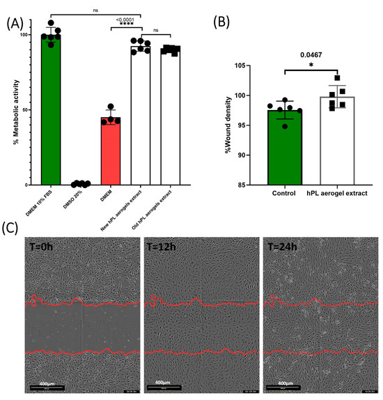 This figure presents the results of the biological evaluation of products released by HPL aerogels. (A) The graph presents the metabolic activity of BALB 3T3 cells when exposed to the media conditioned by HPL aerogels, as measured by the MTT assay. Error bars represent standard deviation. (B) The graph displays the results of the scratch assay performed on HUVECs. It illustrates the migration capability of HUVECs when exposed to the released products from HPL aerogels. Error bars represent standard deviation. (C) The images show the scratch assay at T = 0 h, T = 12 h, and T = 24 h, providing a visual representation of cell migration in response to the released products. The statistical significance of the results was studied using ordinary one-way ANOVA and unpaired t-test with Welch’s correction for p < 0.05 (ns > 0.05, * p < 0.05, **** p < 0.0001). Error bars represent standard deviation (n = 6).