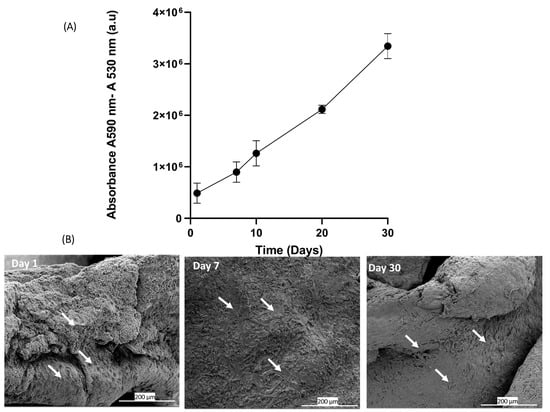 The in vitro analysis of adhesion and proliferation of BALB-3T3 cells seeded on platelet lysate aerogels was evaluated through the measurement of metabolic activity using Alamar Blue assay. The results graphically presented in Figure 8A clearly demonstrate a significant increase in signal over the course of days, correlating with an increase in metabolic activity and cell number [52]. These results indicate that around 70% of the seeded cells adhere, adapt, and proliferate, suggesting that the three-dimensional fibrin network forming the aerogel maintains its biocompatibility and can be used as a cell culture support. The fibrin network can be considered a supportive substrate for cell adhesion and proliferation [53]. The drying process allows the formation of aerogels that preserve this characteristic, as evidenced by scanning electron microscopy (SEM) images of the seeded cells. On day 1, the cells start to adhere to the network, and over the course of days, an increase in cell density is observed on day 7 and day 30 (Figure 8B).