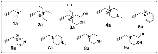 N,N,N-trimethylprop-2-yn-1-aminium (1a), N,N,N-tris(2-hydroxyethyl)prop-2-yn-1-aminium (3a), 1,4-dimethyl-1-(prop-2-yn-1-yl)piperazin-1-ium (4a), and 2,2′-(prop-2-yn-1-ylazanediyl)bis(ethan-1-ol) (9a) were synthesized according to our previous method [37]. Other alkynes were synthesized by following previously reported procedures. These were N,N,N-triethylprop-2-yn-1-aminium (2a) and 1-methyl-3-(prop-2-yn-1-yl)-1H-imidazol-3-ium (6a) [54], 1-(prop-2-yn-1-yl)pyridin-1-ium (5a) [55], 1-methyl-4-(prop-2-yn-1-yl)piperazine (7a), and 1-(prop-2-yn-1-yl)piperazine (8a) [56,57].