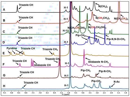 Proton NMR spectra of all chitotriazolan derivatives: derivative 1 (A), derivative 2 (B), derivative 3 (C), derivative 4 (D), derivative 5 (E), derivative 6 (F), derivative 7 (G), derivative 8 (H).