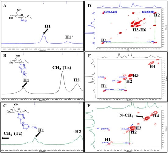Proton NMR and COSY NMR spectra were measured at 343 K. Proton NMR for chitosan (A), derivative 1 (B), and derivative 6 (C); COSY spectra for chitosan (D), derivative 1 (E), and derivative 6 (F). The full spectra are available in the supporting information.