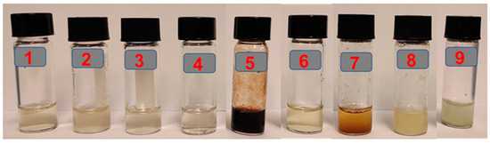 The water solubilities of the chitotriazolan derivatives in distilled water at 25 °C were determined (Figure 4). Chitosan was soluble in acidic solutions at room temperature, while chitosan azide was soluble only in DMSO/DMF at 50 °C. However, all chitotriazolan derivatives demonstrated good water solubility at room temperature. At a concentration of 8 mg/mL, the solubilities of all derivatives were measured. Derivatives containing quaternary or cationic chitosan triazole groups exhibited the clearest visible solubility. Other derivatives that did not contain quaternary groups showed somewhat reduced solubility. Specifically, derivatives 1–6 were highly soluble in water, resulting in clear solutions, while derivatives 7 and 8 were moderately soluble, forming cloudy solutions. Derivative 9 had the least solubility, with some undissolved particles present.