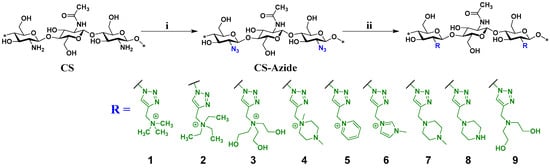 The amino group of chitosan has been protected by a phthaloyl moiety, and the C-6 hydroxyl group has been converted to azide in a multistep synthesis [32,41,42,43,44,45,46,47]. The amino group of chitosan has also been N,N,N-trimethylated, and the C-6 hydroxyl group has been converted to azide, followed by a click reaction [45,48,49]. O-alkyne derivatives of trimethyl chitosan were obtained via a reaction with propargyl bromide under alkaline conditions, and then a click reaction was performed to give N,N,N-trimethyl-N-(2-azido)-ethyl ammonium bromide derivatives [50].