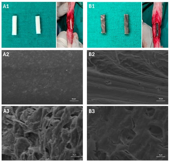 (A1) Nanocomposite polycaprolactone (PCL) + hydroxyapatite (HAP) scaffold and (B1) nanocomposite PCL + HAP + multiwalled carboxylated carbon nanotube scaffold surgically placed in the critical-sized defect in the radius bone. Scanning electron microscope (SEM) image of PCL + HAP scaffold (A2: 1000× and A3: 2000×). SEM image of PCL + HAP + MWCNT-COOH scaffold (B2: 1000× and B3: 2000×).