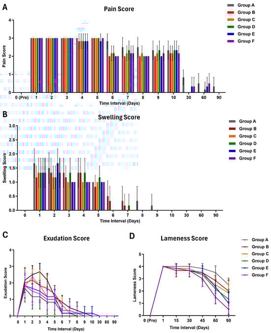 Histogram (mean ± SD) showing (A) pain score and (B) swelling score of various treatment groups at different time intervals. Line graph (mean ± SD) showing (C) exudation score and (D) lameness score of various treatment groups at different time intervals.