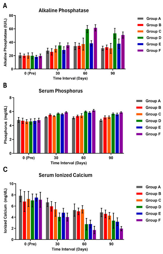 Histogram (mean ± SD) showing (A) serum alkaline phosphatase (IU/L), (B) serum phosphorus concentration (mg/dL), and (C) serum ionized calcium (mg/dL) of various treatment groups at different time intervals.