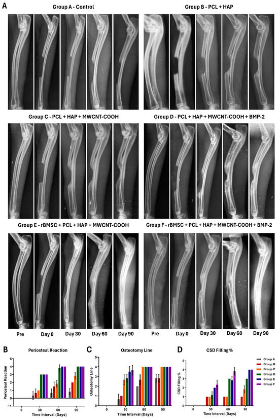 (A) Medio-lateral radiographs showing healing status of different groups at various time intervals (pre, day 0, day 30, day 60, and day 90). Histogram (mean ± SD) showing radiographic (B) periosteal reaction score, (C) osteotomy line, and (D) critical-size defect (CSD) filling % score of various treatment groups at different time intervals.
