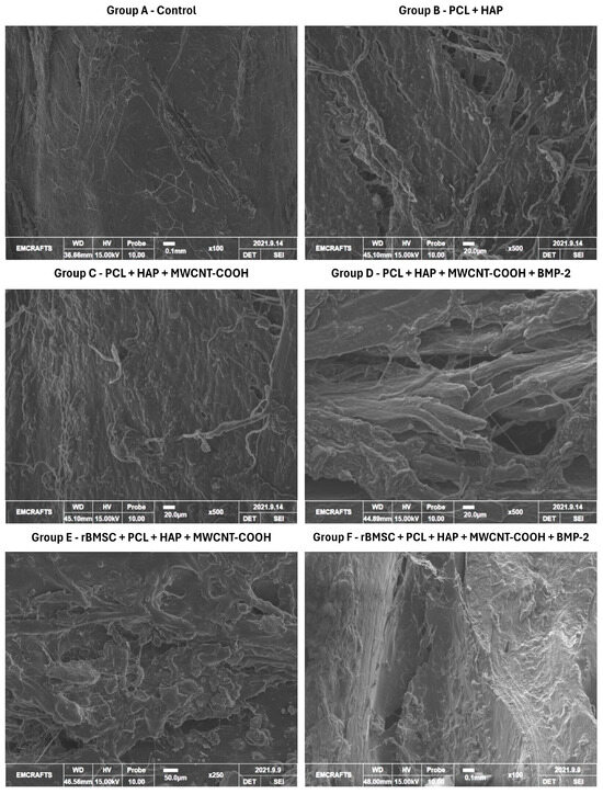 The SEM analysis in the present study revealed distinctive features among the groups. In the control group, collagen fibrils were observed without mineralized bone formation at the defect site. The PCL + HAP and PCL + HAP + MWCNT-COOH groups exhibited irregularly arranged collagen fibrous tissue and minimal mineralized areas at the defect site. In the PCL + HAP group, certain areas of collagenous structures were relatively more intricate and well-connected with surrounding tissues. The PCL + HAP + MWCNT-COOH group showed the presence of a more abundant network of fibrous tissue along with an osseous callus, indicating the initial stages of calcification. The groups receiving stem cells and BMP2 along with the scaffolds demonstrated new bone formation, vascular tissue, and increased marrow space. The stem cell-loaded group exhibited higher compact tissue integration than the BMP2 alone group. Group F, receiving both stem cells and the growth factor, depicted high compactness, increased mineral area, and less marrow space than other groups. Some areas of group F showed pits, indicating sites of resorption and suggesting bone formation under remodeling processes, a finding supported by Singh et al. (2000) during the bone healing process [81].