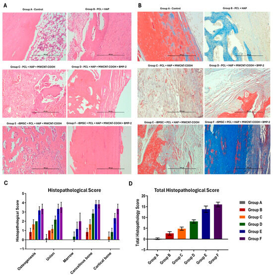 At 90 days post-implantation, the animals underwent euthanasia through intracardiac overdosing of thiopental sodium at a dose of 80 mg per kg body weight. The collected bone samples (n = 6) from each group were fixed and immersed in a decalcifying solution until they were ready for microtome dissection, employing Gooding and Stewart’s fluid [34]. After microtome cutting, the tissues were mounted on poly-l-lysine-coated slides and stained with hematoxylin–eosin (H&E) and special Masson’s trichrome stain for collagen tissue evaluation. The stained slides were assessed using a modified scoring system based on the criteria reported by Lane and Sandhu (1987) and Heiple et al. (1987) (Supplementary Table S4) [35,36].