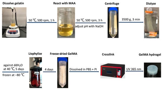 - Shirahama, H.; Lee, B.H.; Tan, L.P.; Cho, N.J. Precise Tuning of Facile One-Pot Gelatin Methacryloyl (GelMA) Synthesis. Sci. Rep. 2016, 6, 31036. [Google Scholar] [CrossRef]