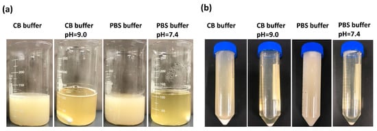In this study, we initially adjusted the pH of the PBS buffer to 7.4 and the pH of the 0.25M CB buffer to 9.0 before investigating the impact of different pH values on the reaction between gelatin and MAA. Throughout the process, two groups were left without adjustment, while the others were maintained at their respective pH levels using 1 N NaOH. We monitored the pH changes in each reaction solution every 30 min for the duration of the synthesis, as outlined in Table 1. In the first hour, there was a significant decrease in pH for both PBS and 0.25M CB reaction solutions, whose pH was not adjusted. As such, the pH changes were marginal for the remaining duration. In addition, the mixture exhibited a white-milky appearance at the end of the 3-h reaction, and the white viscous substance was separated after centrifugation (Figure 2). For the two pH-adjusted groups, the reaction mixture appeared clearer, with fewer precipitates observed after centrifugation. This highlights the necessity for pH adjustment to ensure a thorough chemical reaction.