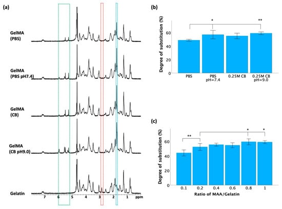 Verification of GelMA synthesis after a 3 h reaction. (a) 1H NMR spectra of GelMA and gelatin. (b) Degree of substitution assessed through TNBS assay at different pH conditions. (c) Degree of substitution assessed through TNBS assay at different ratios of MAA/gelatin. Data in (b,c) is presented as mean ± standard error, and statistical significance (* p < 0.05, ** p < 0.01) was determined using one-way ANOVA.