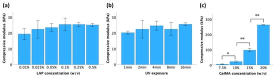 Compressive moduli of GelMA hydrogels when crosslinked at the following conditions: (a) 10% GelMA, UV exposure for 2 min; (b) 10% GelMA, LAP concentration of 0.025%; (c) UV exposure for 2 min, LAP concentration of 0.025%. All the data is presented as mean ± standard error, and statistical significance (* p < 0.05, ** p < 0.01) was determined using one-way ANOVA.