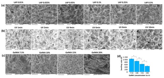 Physical properties of GelMA hydrogels. (a) SEM images of 10% GelMA subjected to 2 min of UV exposure with varying concentrations of LAP. (b) SEM images of 10% GelMA with 0.025% LAP under varying UV exposure times. (c) SEM images of GelMA hydrogels with different gel concentrations using 0.025% LAP and a UV exposure time of 2 min. (d) Swelling ratio of GelMA hydrogels with different gel concentrations using 0.025% LAP and a UV exposure time of 2 min. Data in (d) is presented as mean ± standard error, and statistical significance (* p < 0.05, ** p < 0.01) was determined using one-way ANOVA.