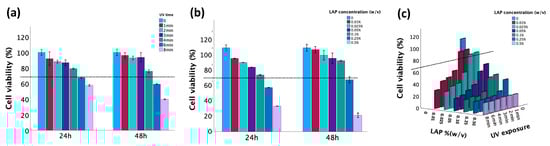 Cell viability measured by MTT. (a) Effect of photoinitiator LAP on cell viability assessed after 24 h and 48 h incubation, respectively. (b) Effect of UV exposure time on cell viability assessed after 24 h and 48 h incubation, respectively. (c) The combined effect of UV and LAP on cell viability assessed after 24 h of incubation. The dotted line represents 70% cell viability.