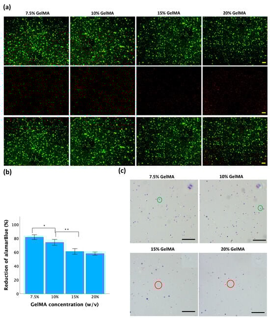 The alamarBlue assay was used to measure metabolic activity, which serves as an indirect indicator of cell viability []. As shown in Figure 7b, the mean reductions of alamarBlue in the 7.5%, 10%, 15%, and 20% GelMA hydrogels were 81 ± 2%, 74 ± 2%, 61 ± 2%, and 58 ± 1%, respectively. As the GelMA concentration increased, the reduction of alamarBlue decreased. Significant differences were observed among all groups except for the comparison between the 15% GelMA and 20% GelMA groups.