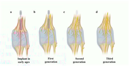 Schematic illustration of the various stages in biomaterials development explained using a screw implanted in the knee joint model. (a) Implant during the early ages with inflammation and cytotoxic effects (knee nerves appearing red). (b) First generation of passive implants with minimal cytotoxic effects. (c) Second generation of biomaterials, which are either bioactive (nerve or bone tissue proliferation) or bioresorbable. (d) Third generation of biomaterials, where the concepts of resorbability and bioactivity are combined (the implant was eventually dissolved and the space was filled by regenerated nerves/tissue) (created with BioRender.com).