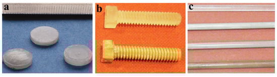 (a) Polycaprolactone (PCL)–phosphate glass disks before implantation (8 mm in diameter) (reprinted with permission from [44]). (b) Screw from PLA (polylactic acid) alone (top), and screw of PLA–phosphate glass fiber composite (down) (reprinted with permission from [45]). (c) PLA-PGF composite rods (top: PLA alone and down: PLA-PGF in the order of P50RM, P50UD, and P40UD rods, where RM stands for random fiber mats and UD stands for unidirectional fiber mats, while P40 and P50 are 40 and 50 mol% of phosphate in the composition) (reprinted with permission from [39]).