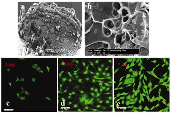 (a) Scanning Electron Microscope (SEM) image of the cross-section of PGF–collagen spiral constructs with the PGF generated at 25 Hz SMF (reprinted with permission from [51]). Scale bar: 200 µm. (b) Fracture surface sample of a heat-treated PLA/PBG fiber composite after 6 weeks of degradation in deionized water at 37 °C [49]. Scale bar: 20 µm. (c) Cytocompatibility assessment using MG63 cells on a PLA-PGF (heat-treated) composite surface on day 1, scale bar: 100 µm. (d) on PLA alone during day 7 (Scale bar: 100 µm.), and (e) on PGF (heat-treated)–fiber/PLA composites on day 7, stained with calcein AM to visualize the live cells green and with propidium iodide to see the dead cells red (reprinted with permission from [49]). Scale bar: 100 µm.