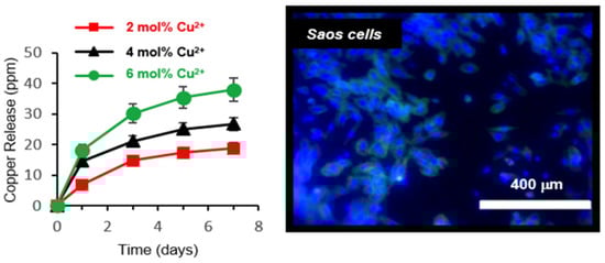 The Cu2+-releasing profile from the Cu-doped phosphate glass and the cytocompatibility assessment test on glass particles show a significant increase in the number of cells in the seeded Saos cells in five days. The nuclei are shown in blue color. (Reprinted with permission from [84], copyright 2019).