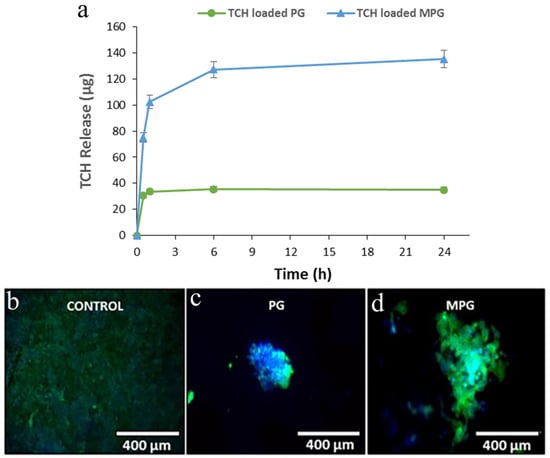 (a) Release profiles of TCH as a function of time from loaded MPG and PG samples, where the loaded MPG shows a more sustained release during the 24 h of the study (reprinted with permission from 98). DAPI–Phalloidin staining after 7 days for the (b) control, (c) non-porous phosphate-based glass (PG), and (d) mesoporous phosphate-based glass (MPG) seeded with Saos-2 cells, visualized using a cell image multimode reader. Cell nuclei (blue) and actin filaments (green) show the cells attached and spread on the MPG and PG surfaces after 7 days of seeding (reprinted with permission from 98).