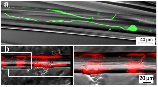 (a) DRG neurons on glass fibers extended along the fiber axis direction (reproduced with permission from 104); (b) confocal microscope image showing NOBEC (Neonatal Olfactory Bulb Ensheathing cell line) cells spread on the glass surface and enveloping the glass fiber, with the magnified version on the right side (reproduced with permission from 104).