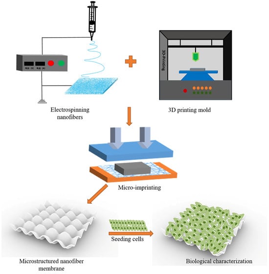 In this context, this paper innovatively combined electrospinning and micro-imprinting processes to create a nanofiber membrane that simulates the fluctuating structure of natural skin DEJ. In this study, four kinds of PLGA-PCL membranes were prepared by adding different proportions of PCL materials to a PLGA electrospinning solution. Then, PLGA-PCL membranes with comprehensive properties were selected through Fourier transform infrared spectroscopy (FTIR) testing, micro-morphology, mechanical properties, dimensional stability, hydrophilicity, and biocompatibility of different membranes. At the same time, microstructural molds with a diameter, depth, and spacing of 200 μm were fabricated using a light-curing 3D printer. Finally, PLGA-PCL microstructural membranes were prepared by the micro-imprinting process. The preparation process is shown in Figure 1.