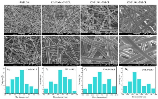 As shown in Figure 2A–D,A1–D1, the surface morphology of nanofiber membranes, produced with four distinct concentration ratios, was presented at various magnifications. The nanofibers produced by the electrospinning process have good diameter uniformity, in addition to the absence of microbead defects on the surface of the nanofiber membranes. The diameter distribution of the nanofibers is shown in Figure 2A2–D2. The average diameters of the four types of nanofibers were 520.9 ± 163.3 nm, 757.3 ± 146.3 nm, 1740.1 ± 196.8 nm, and 2408.2 ± 228.5 nm, respectively. In the preparation process, except for varying concentrations of the PLGA-PCL electrospinning solution, the environmental (temperature, humidity) and parameters (voltage, flow rate, needle diameter, collector distance) controlling the electrospinning process were kept consistent. Therefore, in the experiment, the properties of electrospinning nanofibers are only related to the electrospinning solution. It was found that as the PCL concentration in the electrospinning solution increased, the viscosity of the solution also increased. The droplet splitting ability decreases as the viscosity of the solution increases, resulting in larger-diameter electrospun nanofiber in a constant voltage during electrospinning [,].
