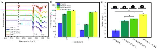 Investigation of the FTIR test, shrinkage characteristics, and hydrophilicity of PLGA-PCL nanofibers. (A) Functional group analysis of PLGA-PCL nanofiber membranes using FTIR. (B) Shrinkage behavior. (C) Hydrophilicity; ** p < 0.01, * p < 0.05.
