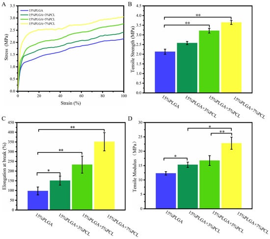 Investigation of the mechanical properties of PLGA-PCL nanofibers. (A) Stress–strain curves. (B) Tensile strength. (C) Elongation at break. (D) Tensile modulus; ** p < 0.01, * p < 0.05.