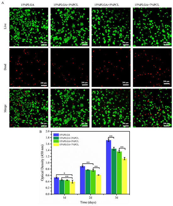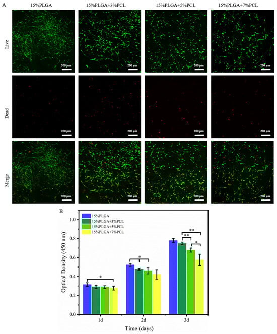 Evaluation of the biocompatibility of PLGA-PCL membranes for HaCaTs. (A) Live/dead staining of HaCaTs on nanofiber membranes. (B) Quantitative analysis of HaCaTs proliferation; ** p < 0.01, * p < 0.05.