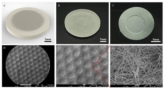 Evaluation of microstructured nanofiber membranes. (A) The 3D model of microstructured molds. (B) Light-curing printed molds. (C) 15%PLGA + 5%PCL membranes prepared. (D,E) Microstructured nanofiber membranes at different magnifications. (F) Micromorphology within the microstructured regions of the nanofibers (×1000).