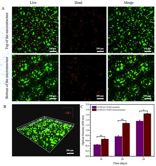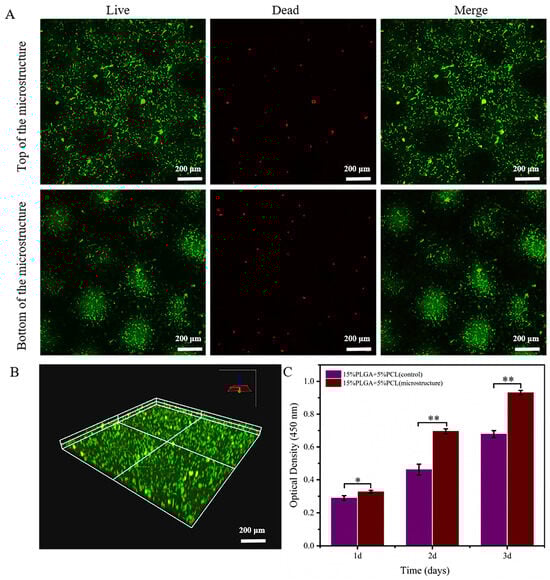 Assessment of biocompatibility of 15%PLGA + 5%PCL microstructure membrane for HaCaTs. (A) Live/dead staining of HaCaTs after 3 days of culture. (B) Confocal images displaying live/dead staining of HaCaTs. (C) Quantitative analysis of HaCaTs proliferation on microstructure membrane and flat membrane; ** p < 0.01, * p < 0.05.